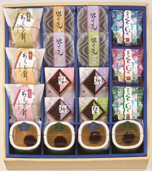 自然の素材を大切にし、風味と彩りへのこだわりが「風さらさ」を創り出しました。吟味された最高の材料を使用した「水ようかん」「くず餅」「わらび餅」を詰め合わせました。 ーーー 内容量:水ようかん(小豆)(栗)各1 小豆くず餅(桜)(抹茶)各1 わらび餅(本蕨)(栗)(小豆)各1 くずもち(純)(桜)(抹茶)各1 サイズ:310×265×55mm 1,050g アレルギー物質:大豆 賞味期限:製造から常温180日