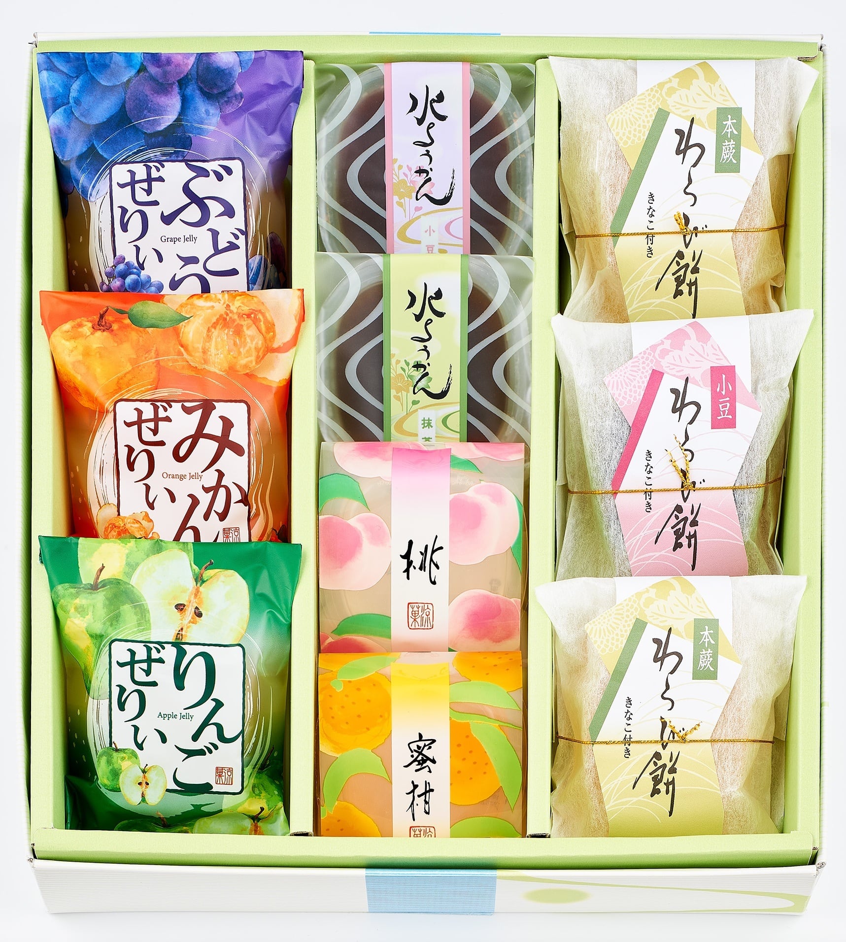 伝統の技で風味豊かに作り上げた「わらび餅」。まろやかで溶けるような口あたりの「水ようかん」。新鮮な果汁を丸ごととじ込めた「フルーツゼリー」。和と洋が織りなす涼菓の彩りをお楽しみください。