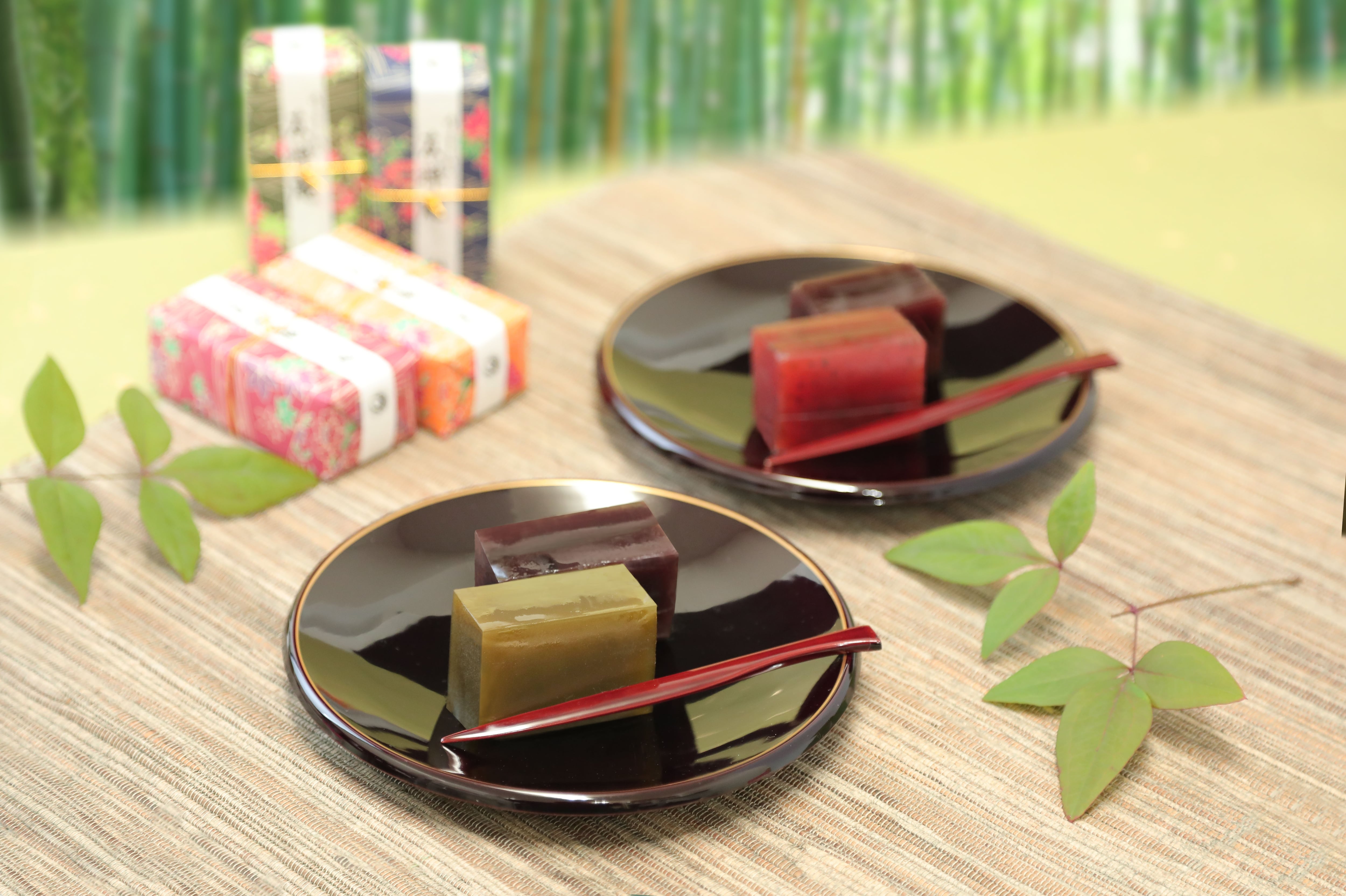粒よりの栗を透明な寒天ゼリーに包み、伝承の技で作り上げた「のれん栗」と、「粒」、「梅」、「茶」のバラエティーな味が楽しめるミニようかん「友禅庵」との詰め合わせです。