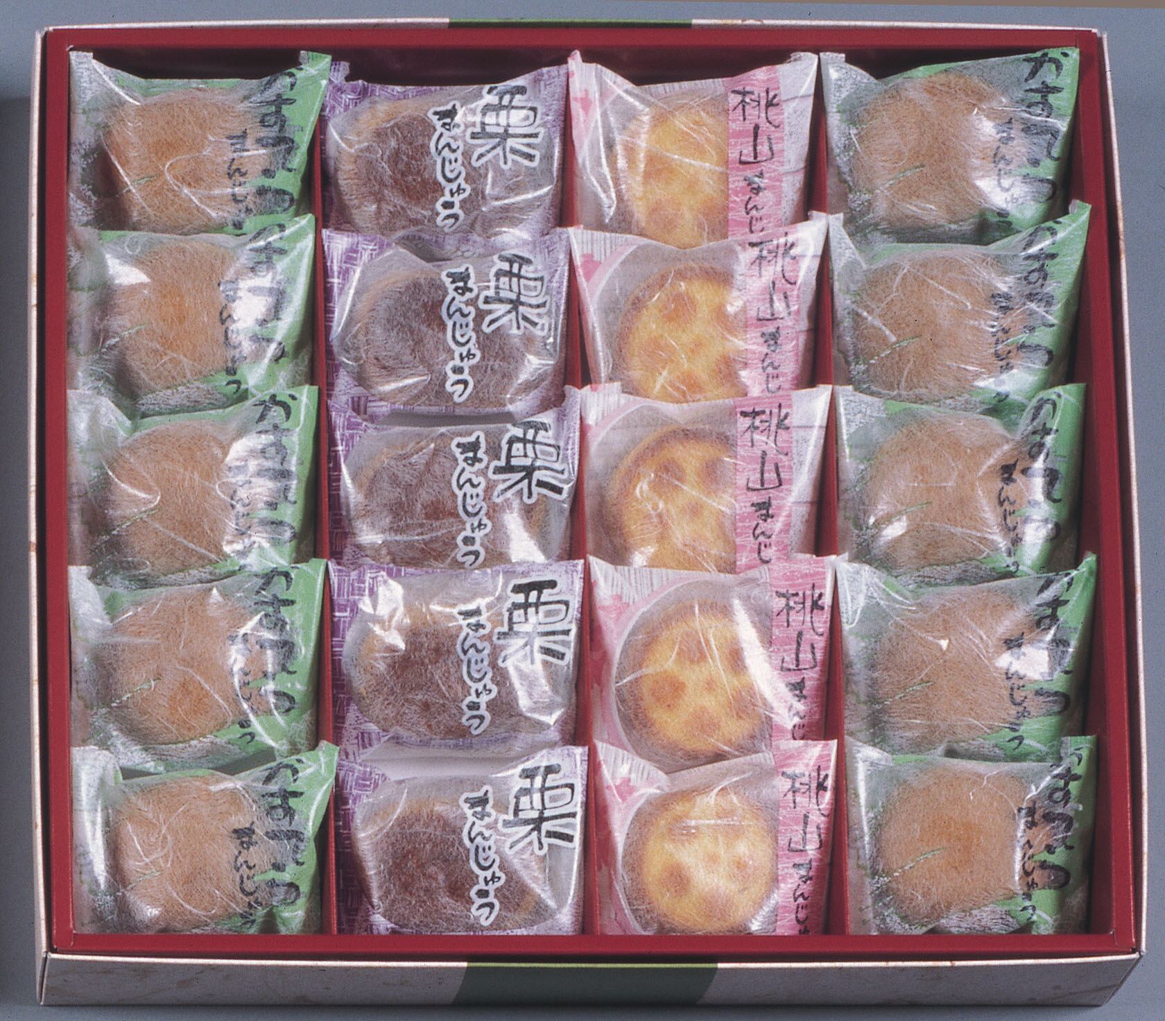 「栗まんじゅう」、「桃山」、「かすてらまんじゅう」、日本の代表的な伝統焼き菓子を三品詰め合わせた、和の心と自然の風味を味わっていただける自信作です。